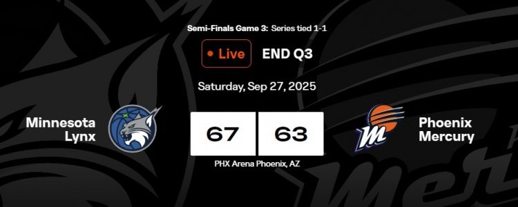 有时网9月27日讯 WNBA季后赛半决赛G3(大比分目前1比1),山猫对阵水星。第三节比赛,山猫打出23比15,一举反超比分。