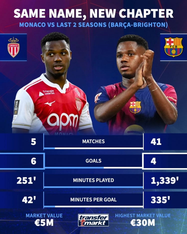有时网10月7日讯 法蒂今夏从巴萨租借加盟摩纳哥,德国转会市场统计了法蒂过去两个赛季在巴萨、布莱顿的数据,以及本赛季在摩纳哥的数据,做出对比。 法蒂过去两个赛季数据 比赛——41 进球——4 出场时间——1339分钟 每335分钟进一球 法蒂本赛季数据: 比赛——5 进球——6 出场时间——251分钟 每42分钟进一球